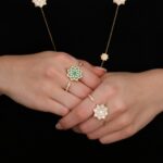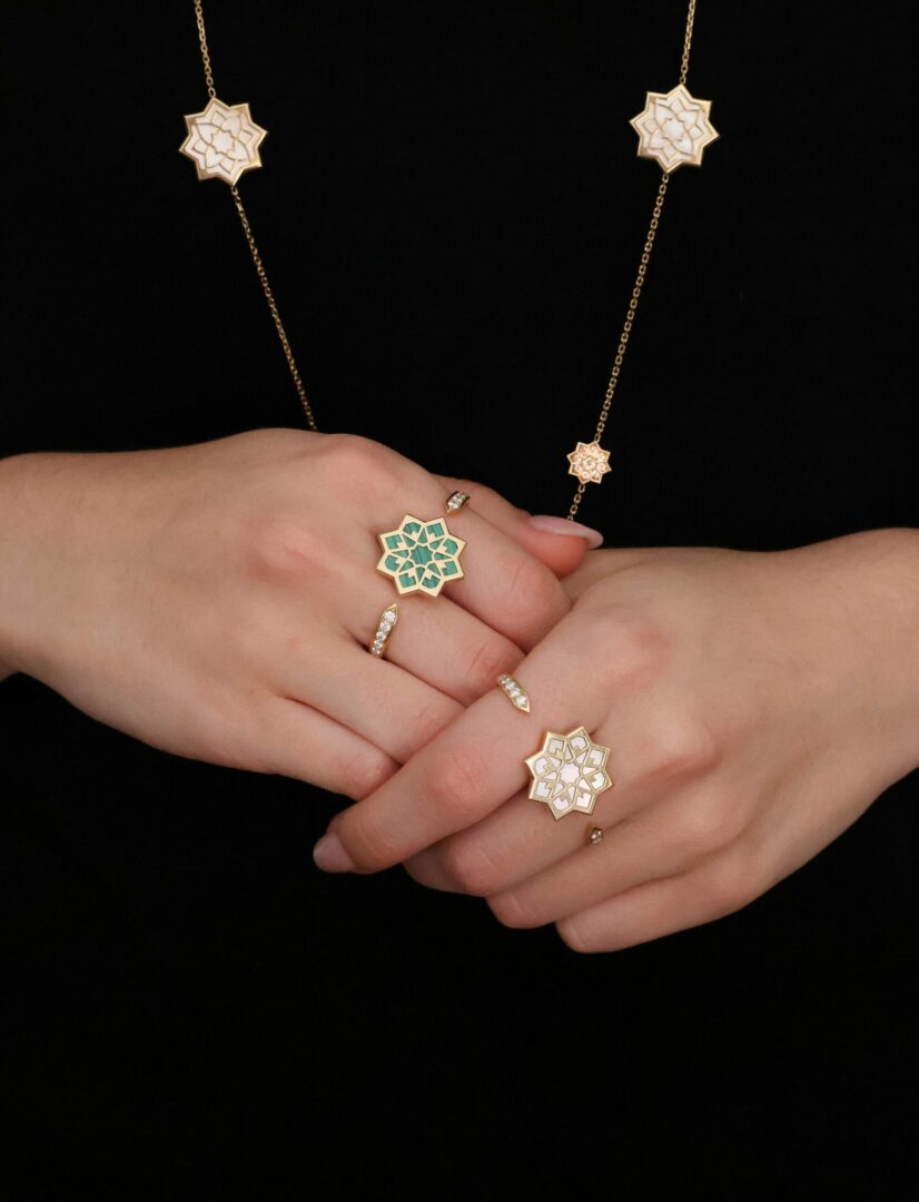 Imaginées comme des étoiles capturant l’essence de l’univers, ces pièces enferment délicatement en leur cœur des pierres semi-précieuses, témoins silencieux de l’aube de notre Terre.