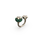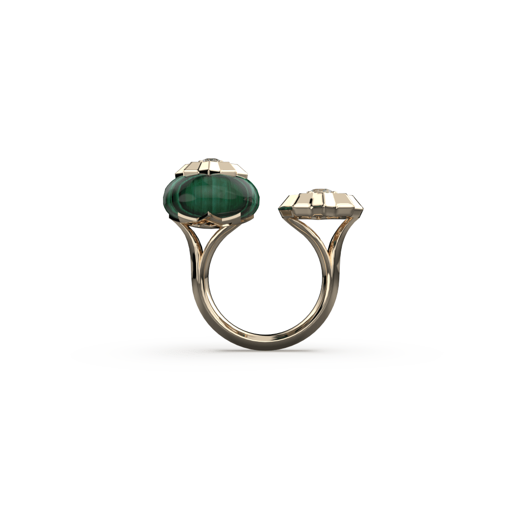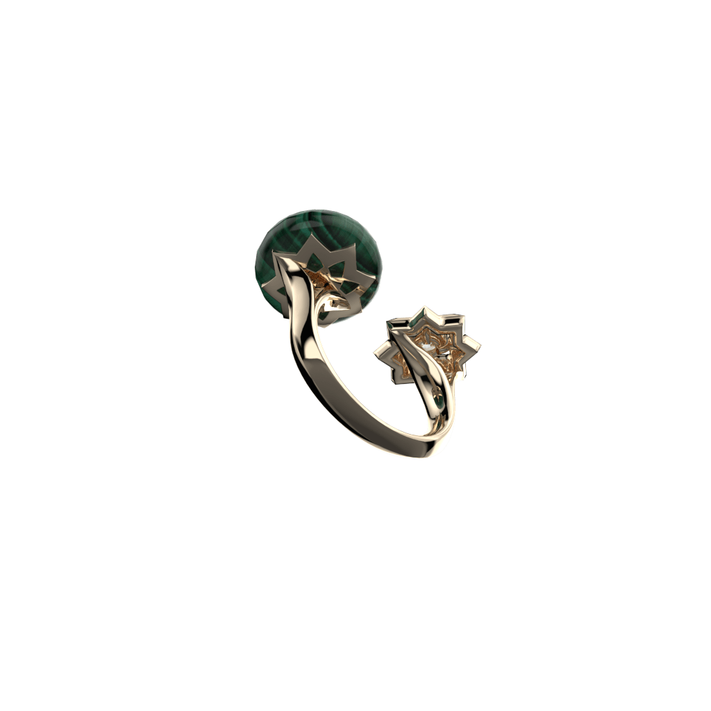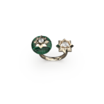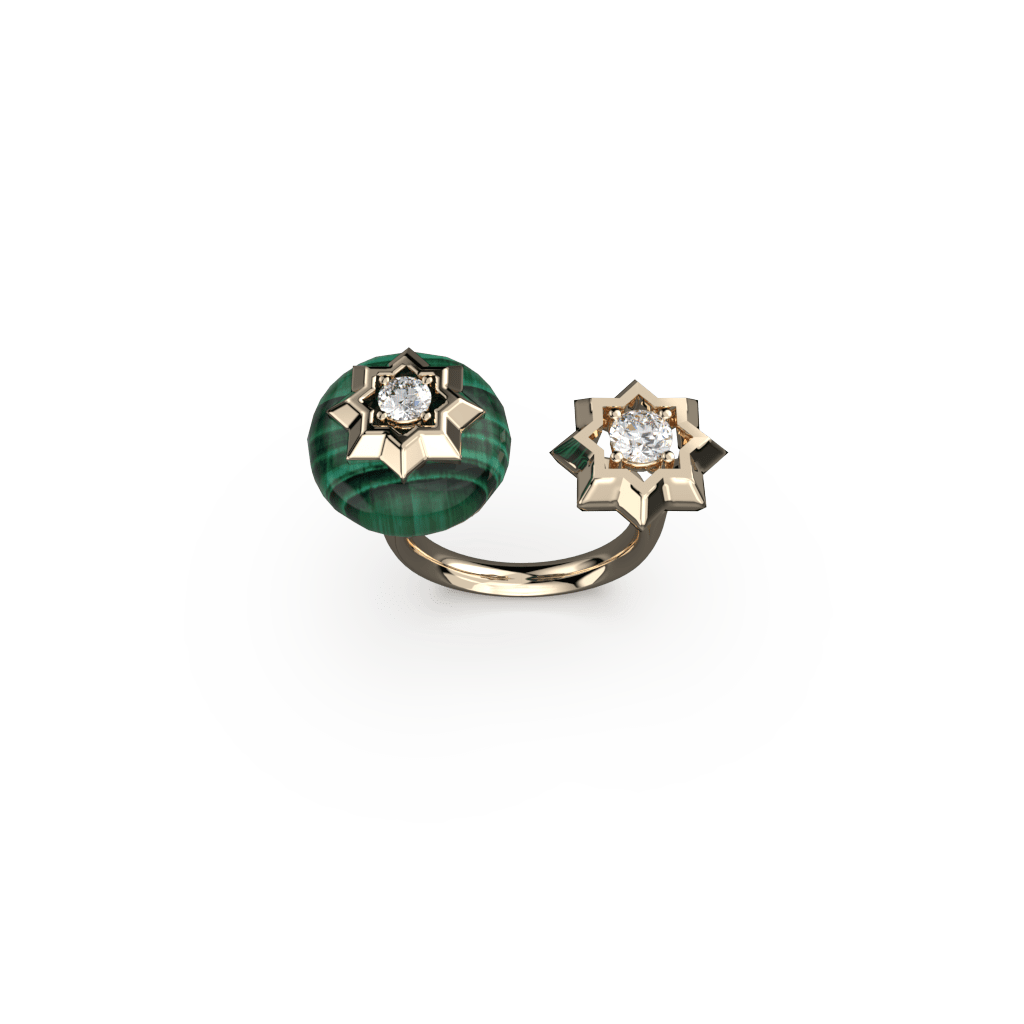 Évoquant l’élégance intemporelle et la splendeur céleste, cette demi-bague se caractérise par son corps délicat disponible en or blanc, rose ou jaune et une pierre taillée en malachite, cornaline, lapis lazuli ou onyx est délicatement encranée par des étoiles scintillantes, chacune surmonté de diamants d’exceptions.