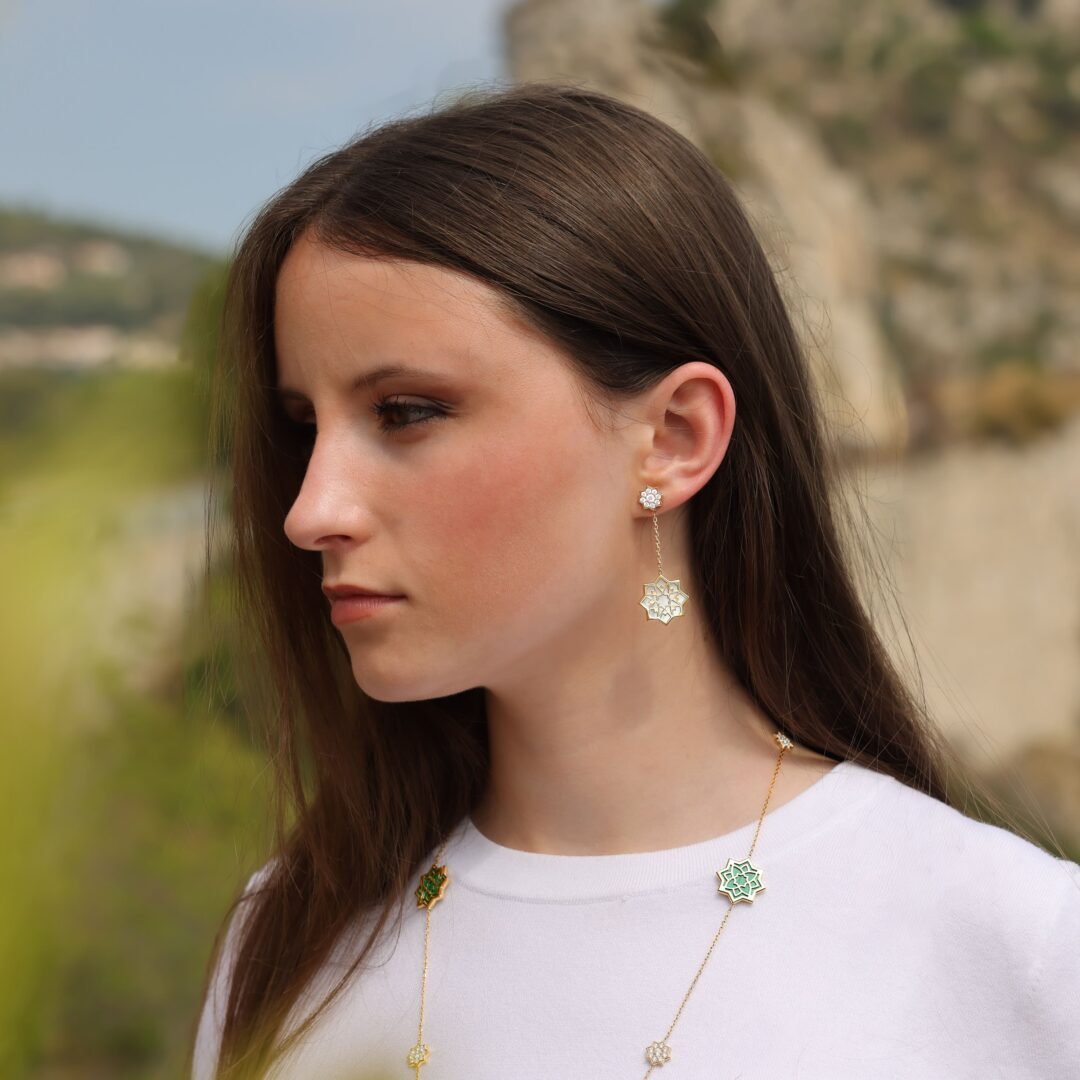La nacre, aux reflets lunaire et apaisants, la malachite, d’un vert profond évoquant les forêts ancestrales de notre planète, la turquoise, rappelant les eaux primordiales d’un bleu infini, et l’onyx, d’une élégance sombre et mystérieuse, sont toutes enchâssées dans des étoiles finement ouvragées. Ces joyaux ne sont pas de simples ornements ; ils sont le lien entre vous et les origines mystiques de notre monde, capturant l’essence même de la beauté primitive dans un design intemporel.