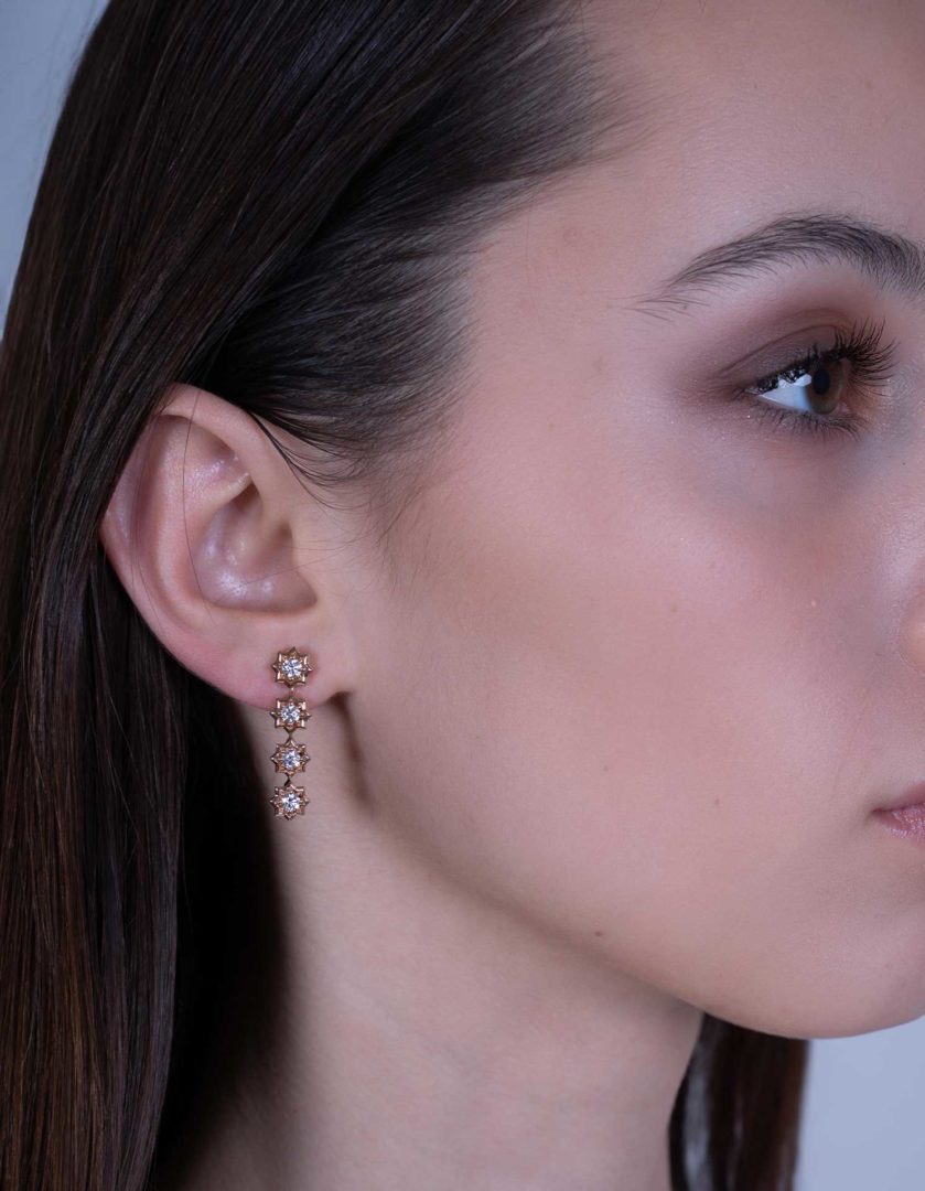 Paire de boucles d’oreilles constellées, inspirées des corps célestes à 8 branches, ornée de somptueux diamants de très haute qualité. L’audacieuse collection Célestine affirme un goût prononcé pour un luxe affirmé.