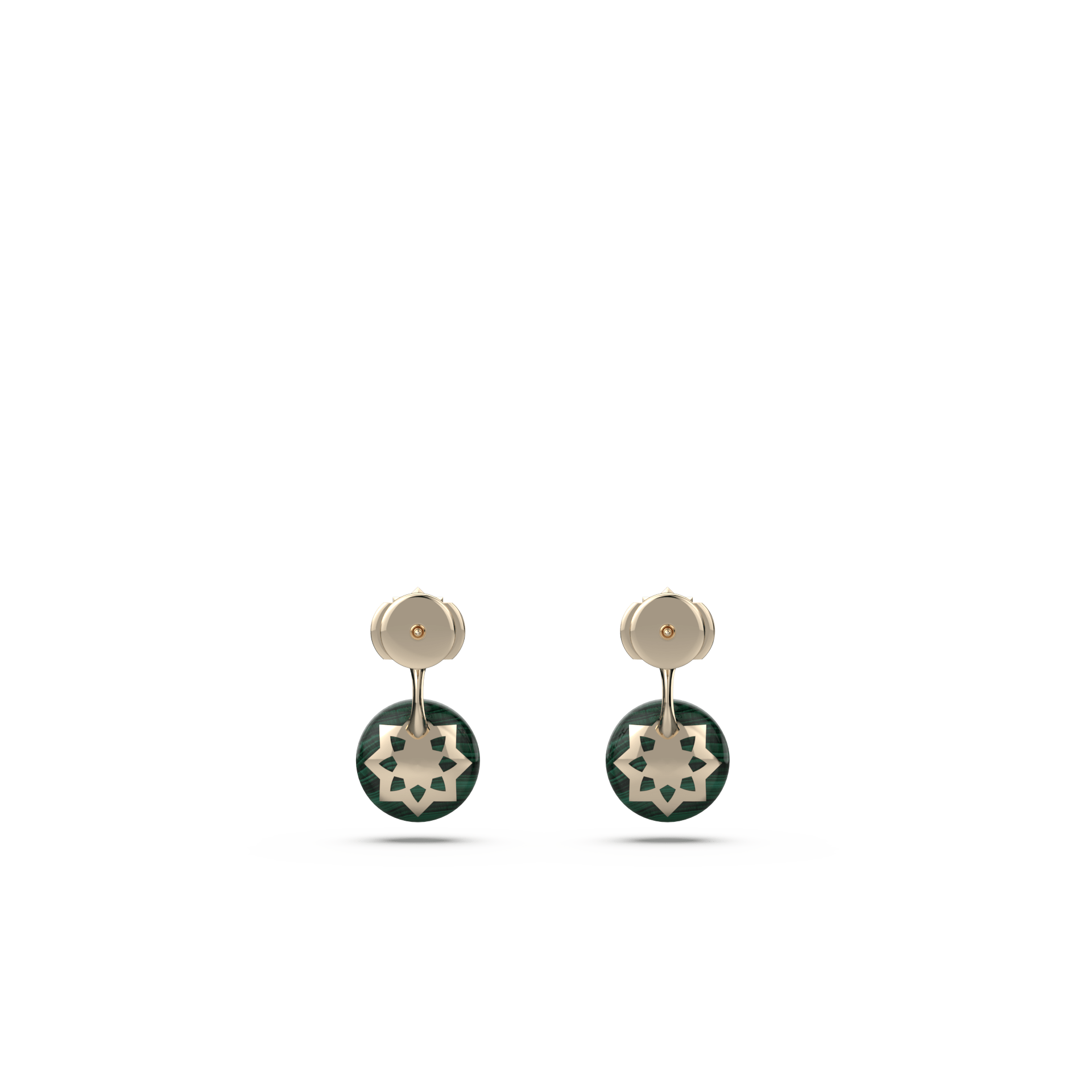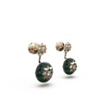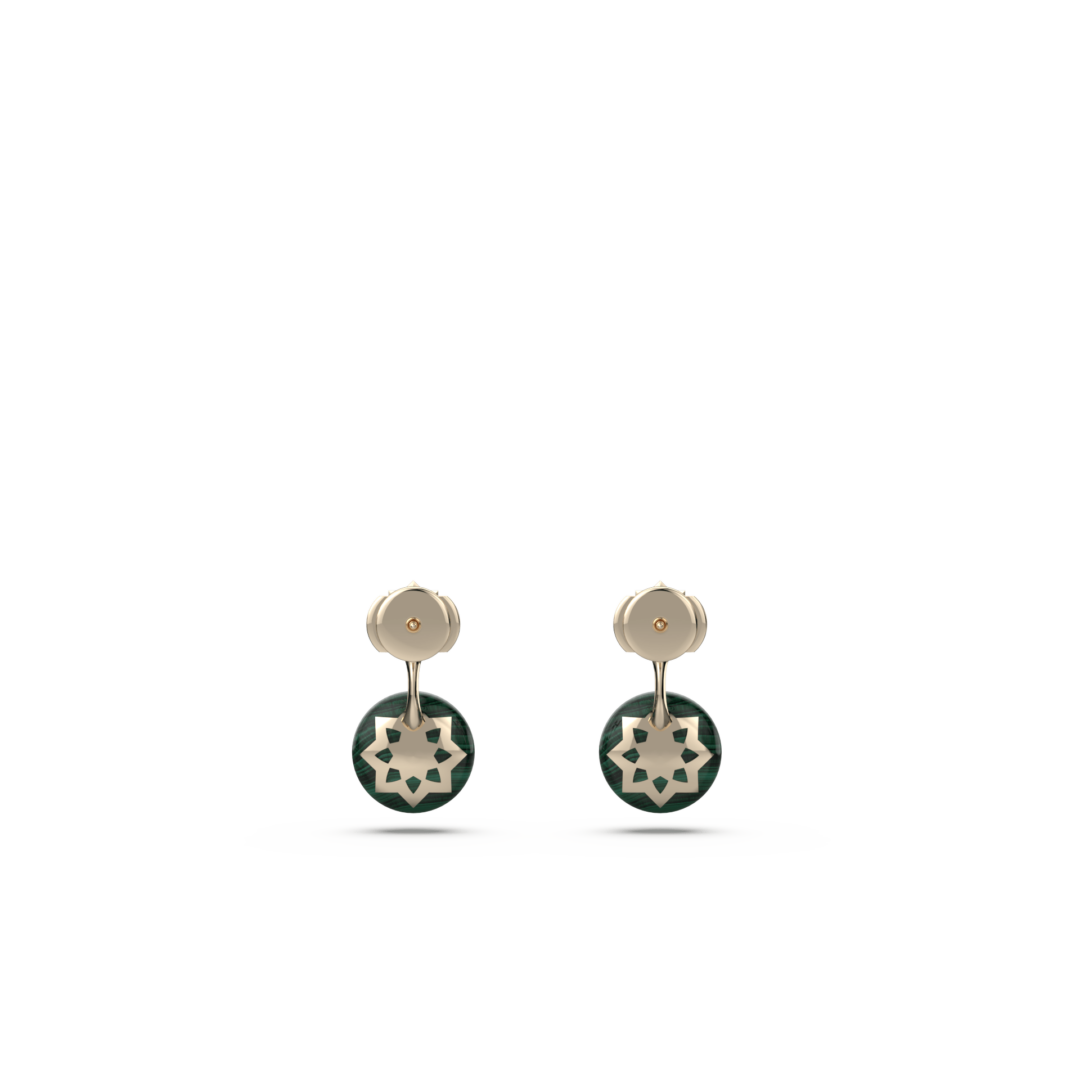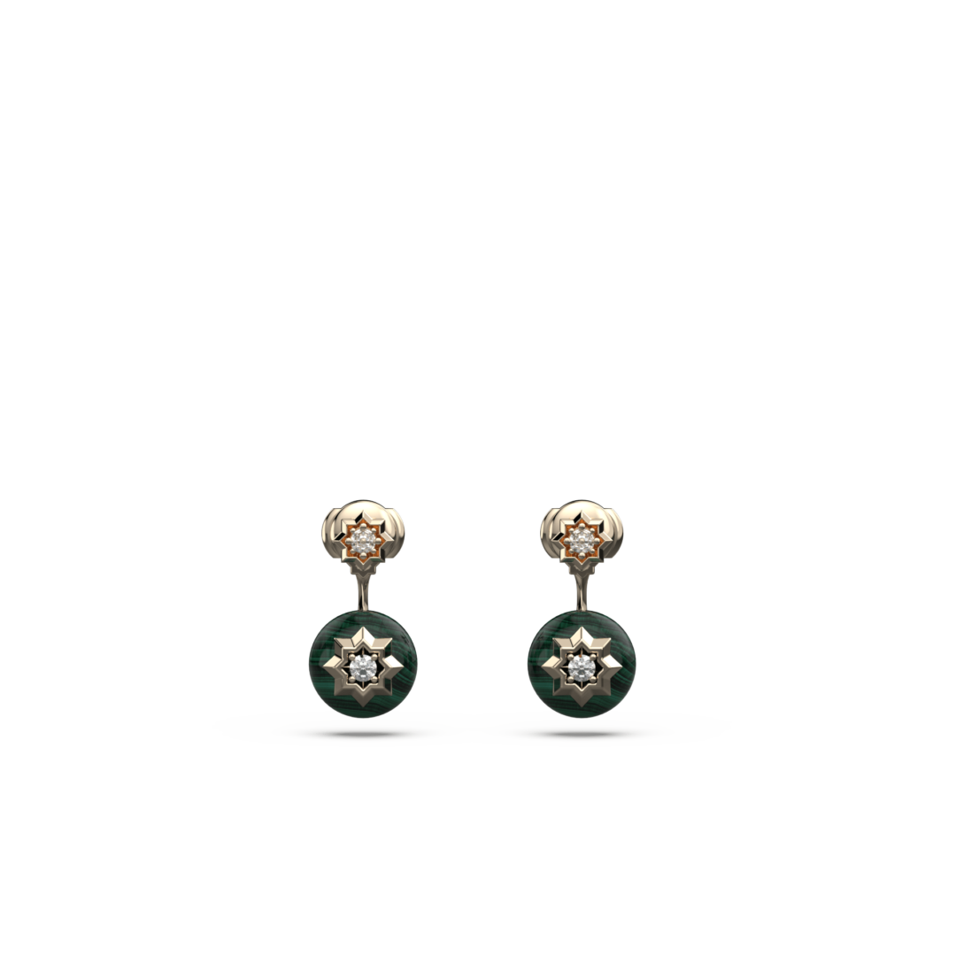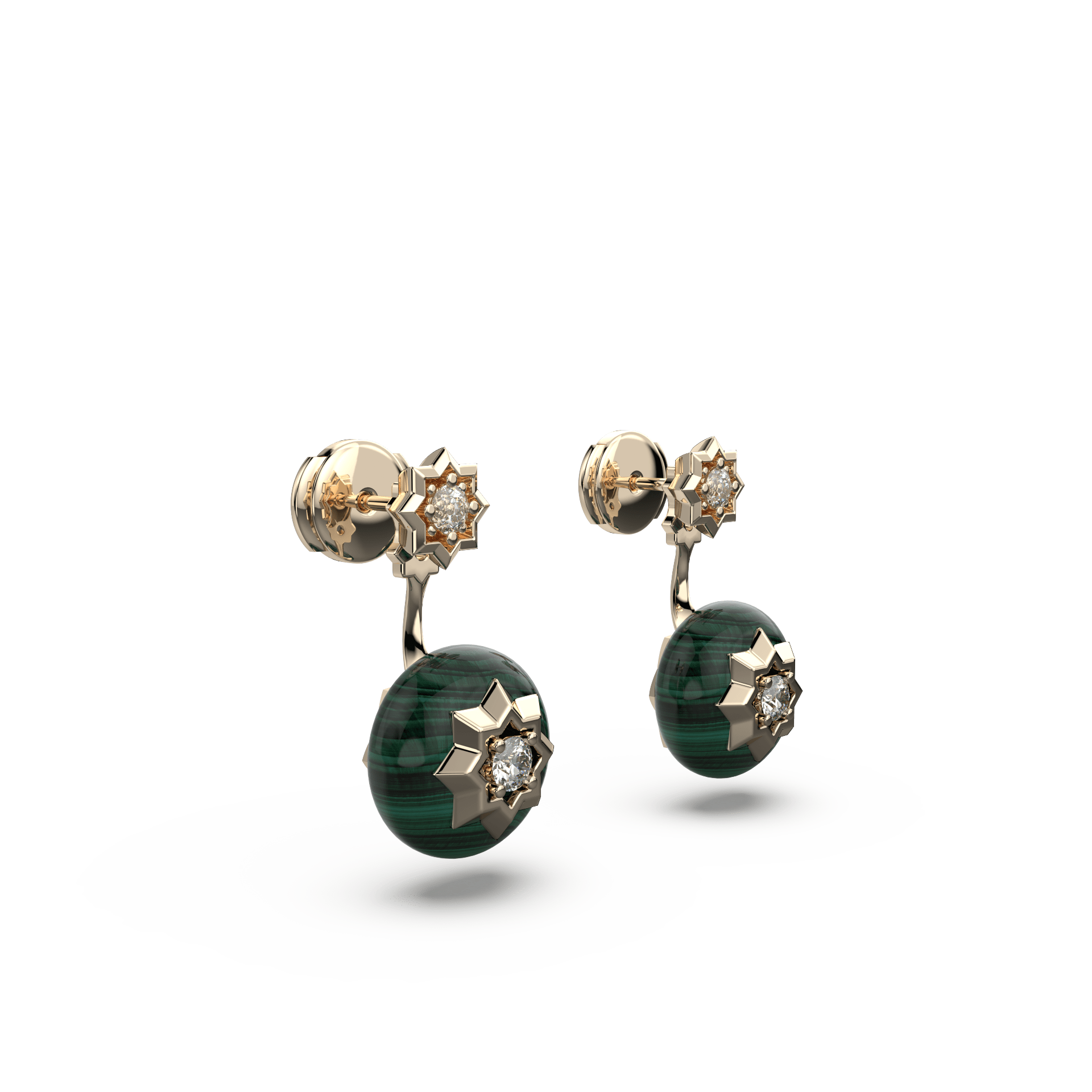 Évoquant l’élégance intemporelle et la splendeur céleste, ces boucles d’oreilles se caractérisent par son corps délicat disponible en or blanc, rose ou jaune et une pierre taillée en malachite, cornaline, lapis lazuli ou onyx est délicatement encranée par des étoiles scintillantes, chacune surmonté de diamants d’exceptions.