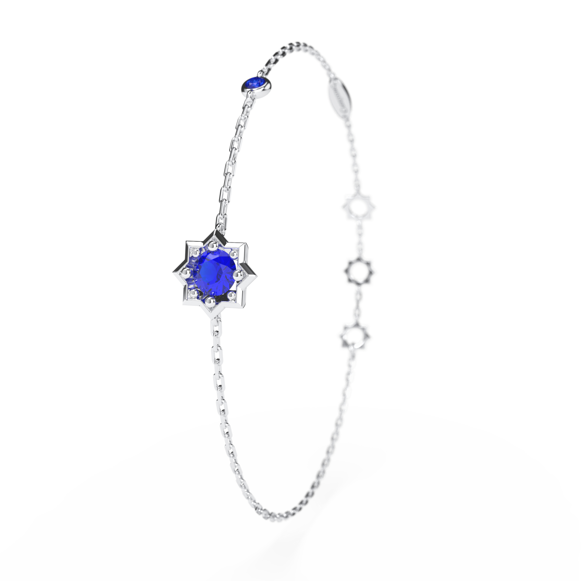 Bracelet constellé, inspirée des corps célestes à 8 branches, ornée de 2 somptueux saphirs bleus de très haute qualité. L’audacieuse collection Célestine affirme un goût prononcé pour un luxe affirmé.
