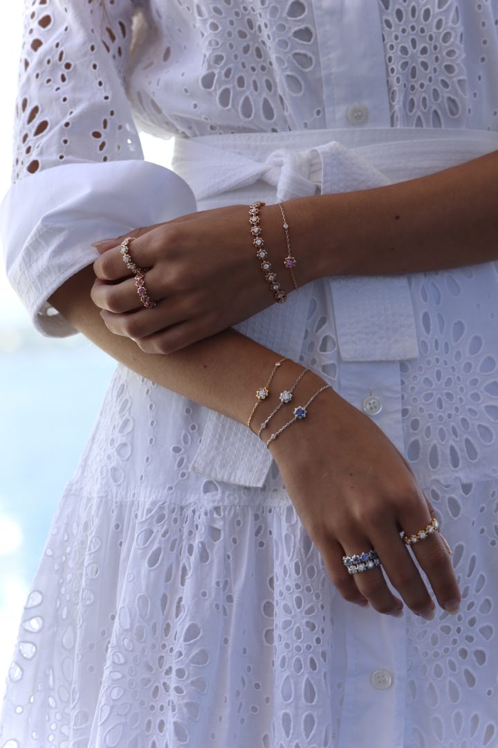 Le bracelet Célestine est disponible en or blanc, rose, et en or jaune assortie de diamants ou saphir bleu ou rose.