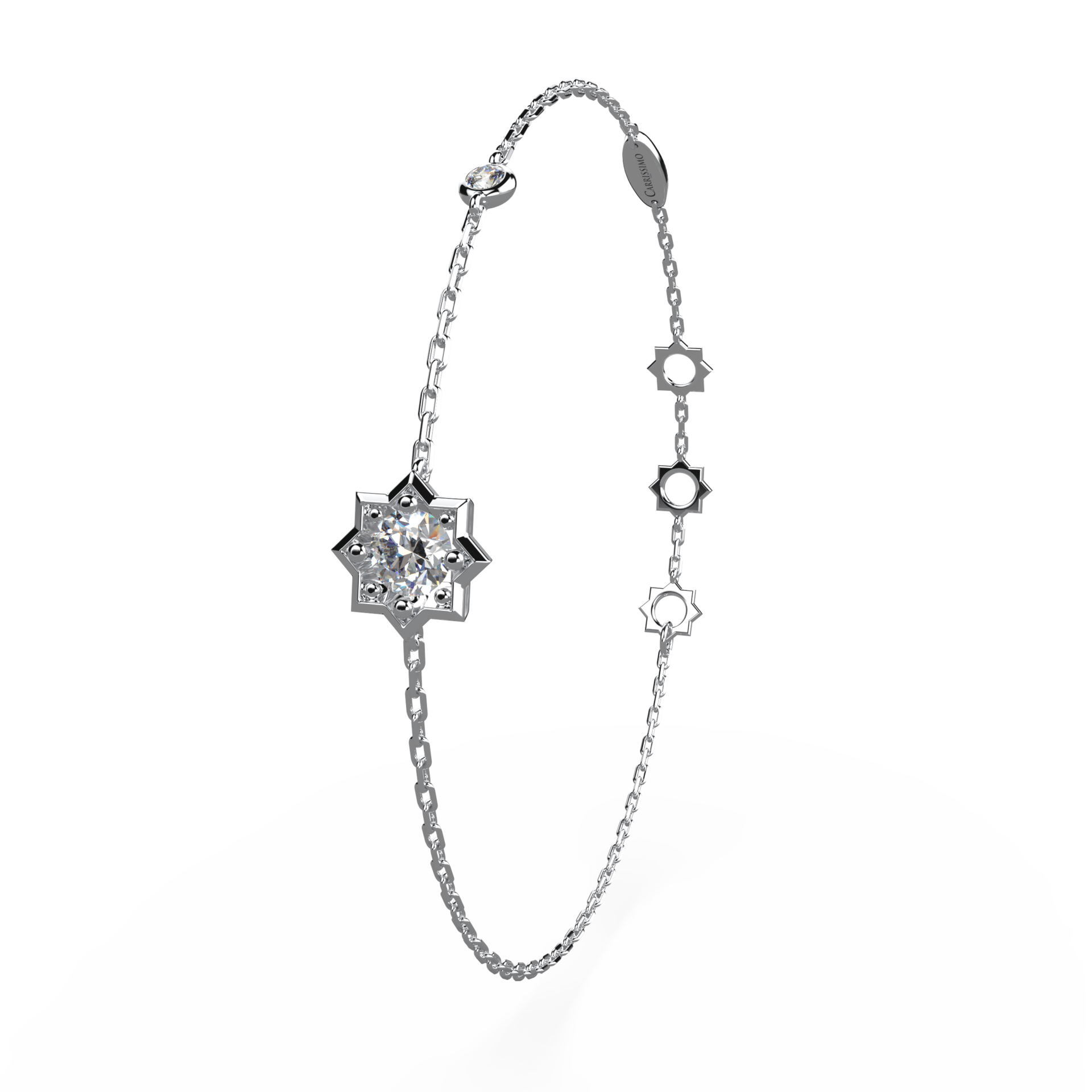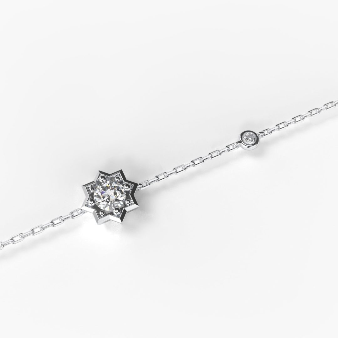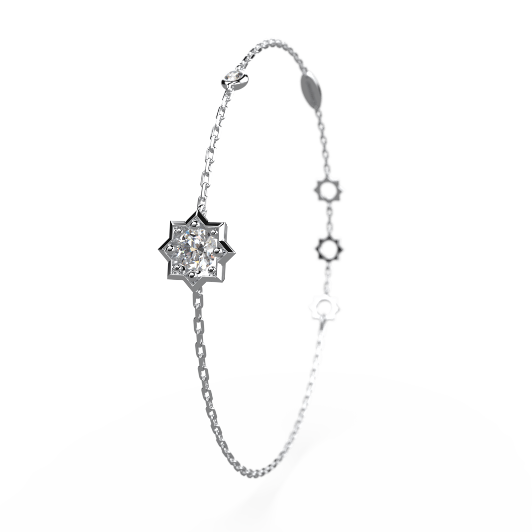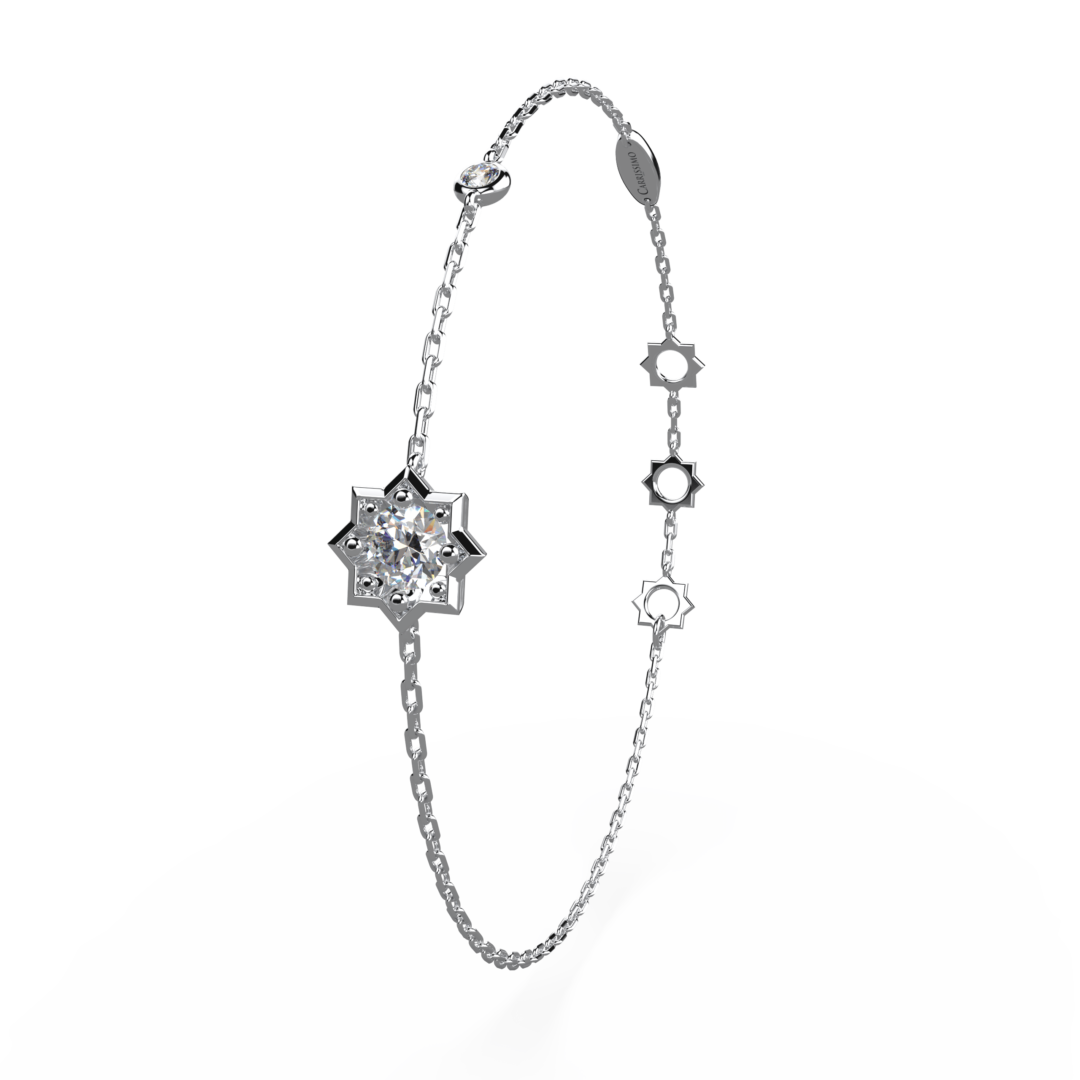 Bracelet constellé, inspirée des corps célestes à 8 branches, ornée de 2 somptueux diamants de très haute qualité. L’audacieuse collection Célestine affirme un goût prononcé pour un luxe affirmé.