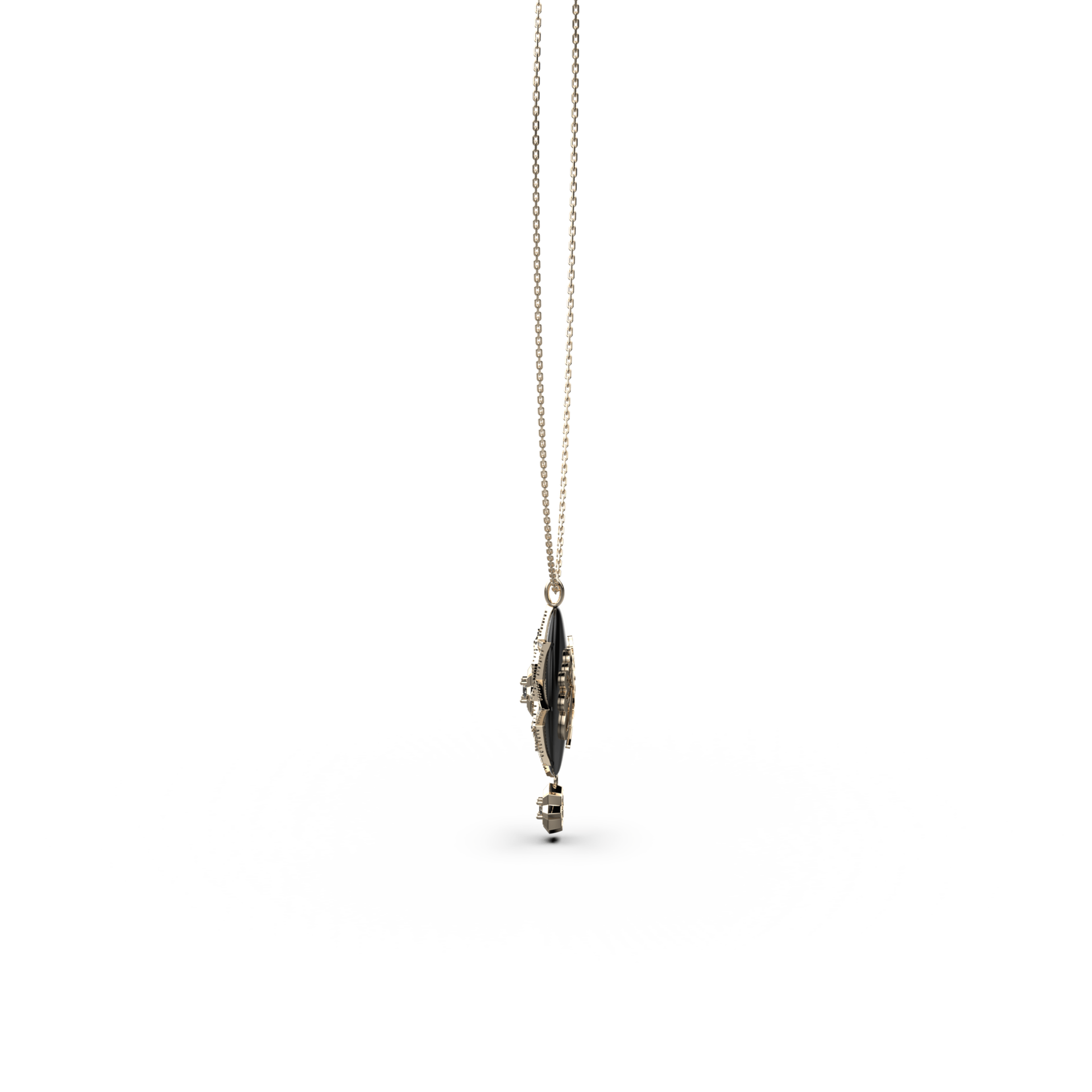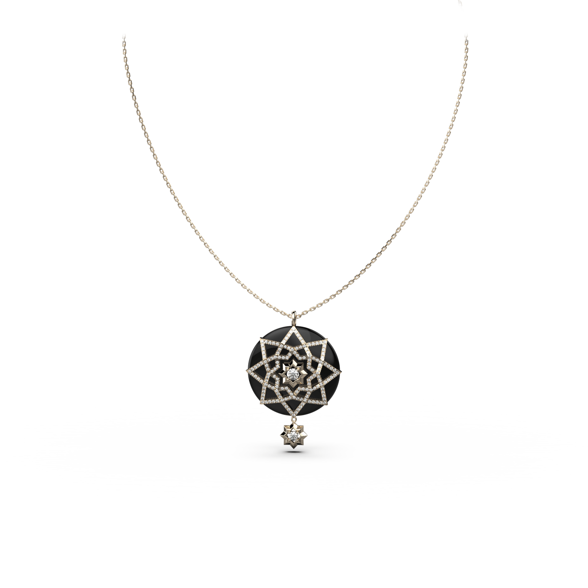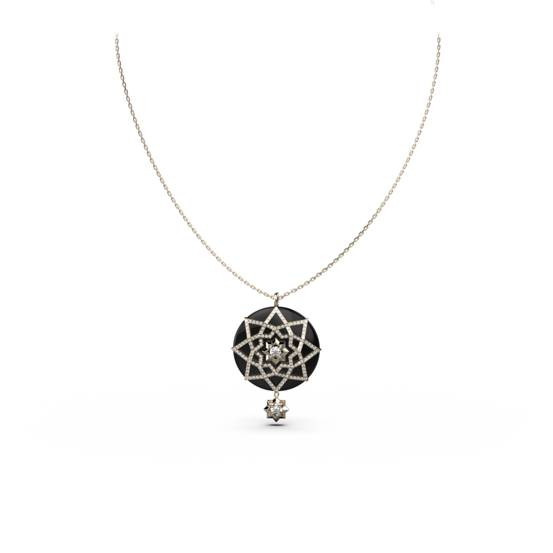 Évoquant l’élégance intemporelle et la splendeur céleste, ce collier se caractérise par son corps délicat disponible en or blanc, rose ou jaune et une pierre taillée en malachite, cornaline, lapis lazuli ou onyx est délicatement encranée par des étoiles scintillantes, chacune surmonté de diamants d’exceptions.